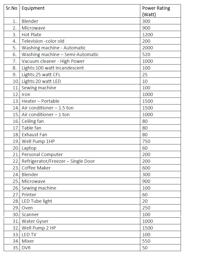 SR.NO Appliance Name Power Rating (Watt) Number of Appliences Hours of Use (Hrs) Total (Watt)
